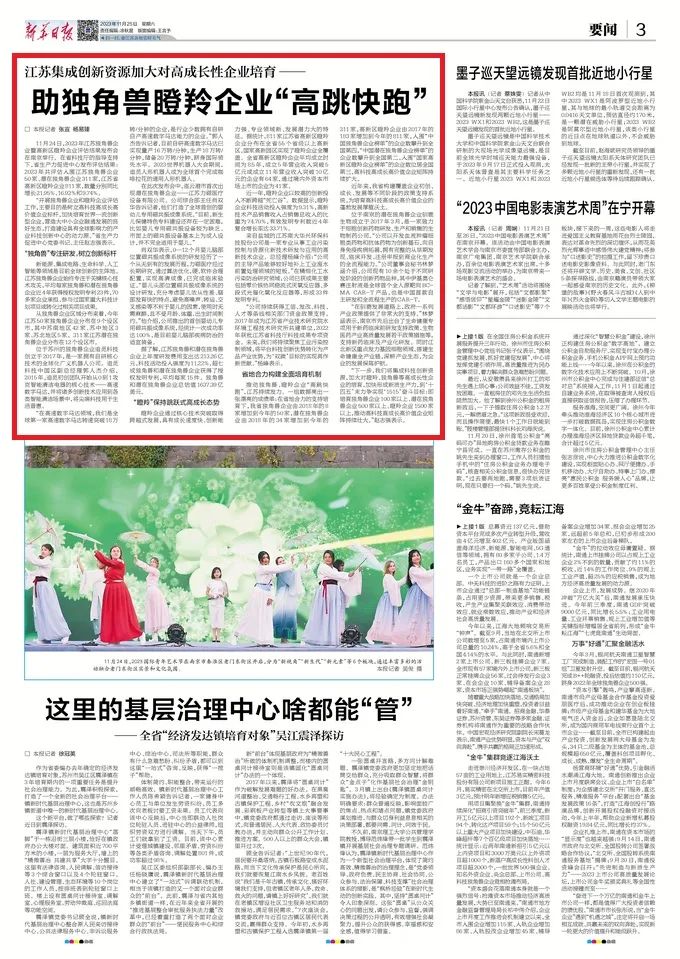 江苏集成创新资源加大对高成长性企业培育 ——助独角兽瞪羚企业“高跳快跑”